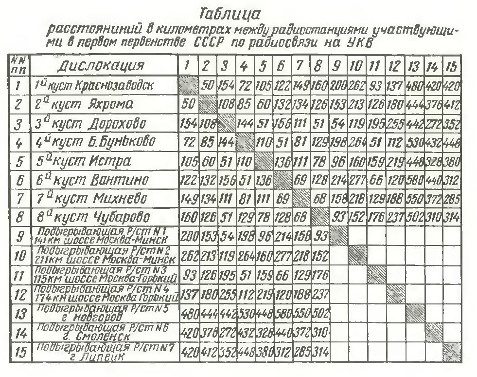 1963г. - 1-е Очные УКВ соревнования: таблица расстояний.