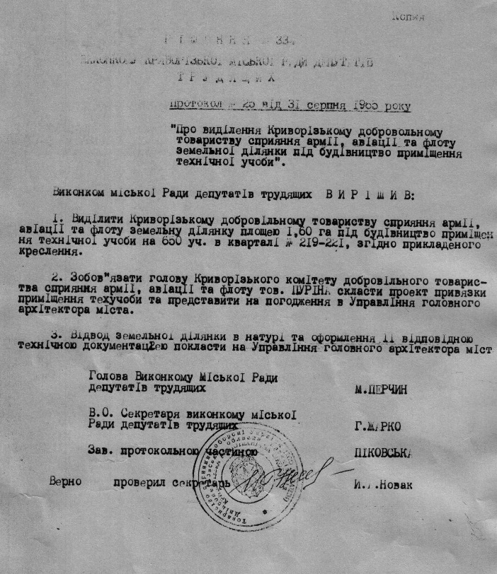 Решение о выделении земли для строительства Криворожской радиотехнической школы.