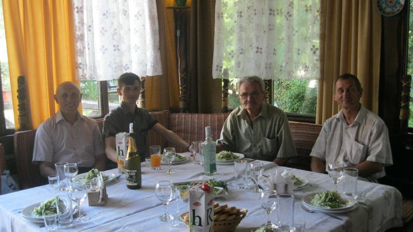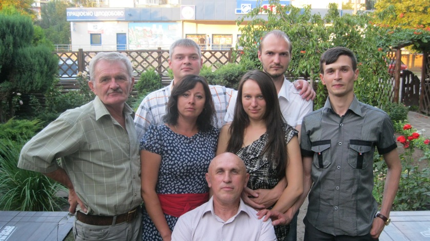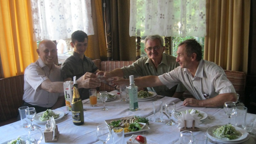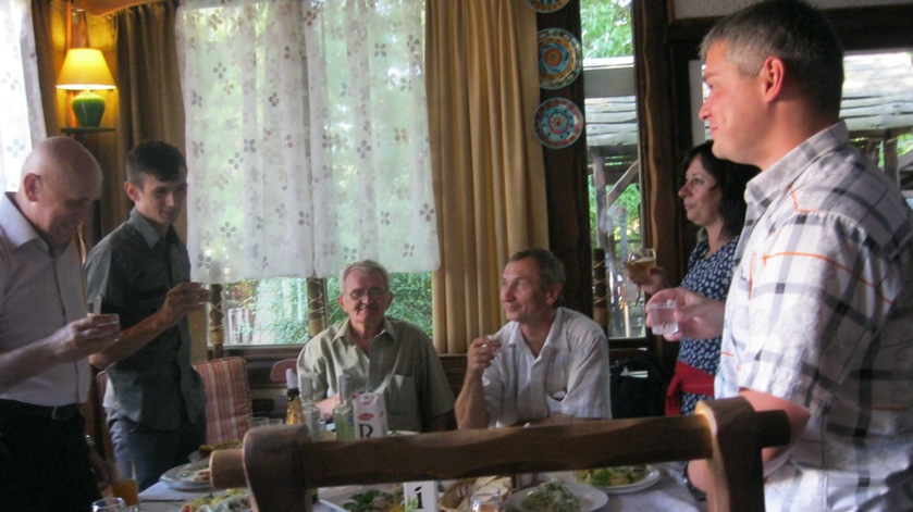 UT4EK, UV5ENH, UR5EDK, UT1EE за столом. За здоров'я ювіляра! Дружні тости. Гості в повному складі. Ювіляр в центрі.