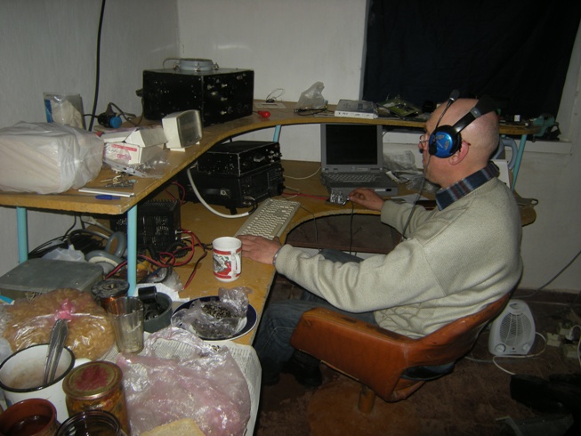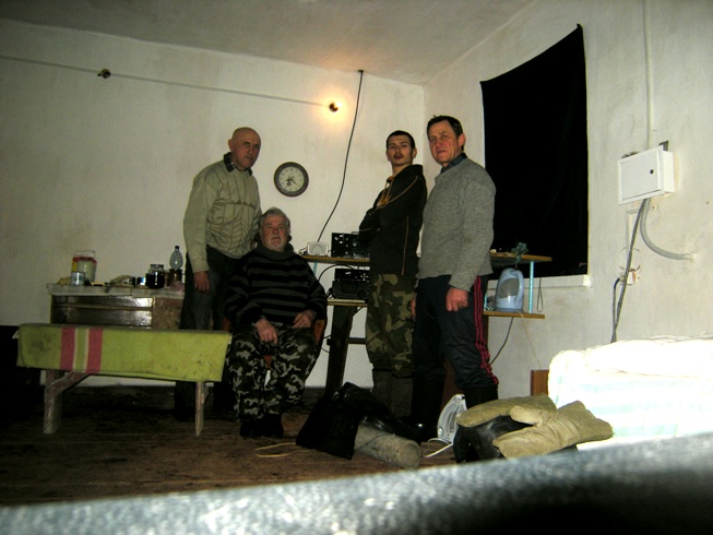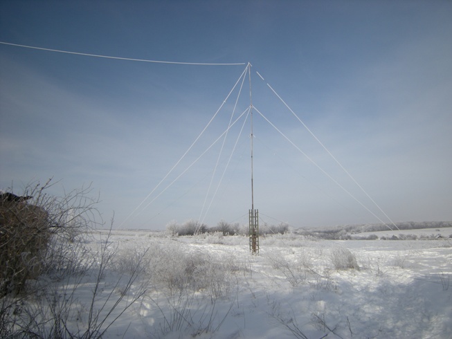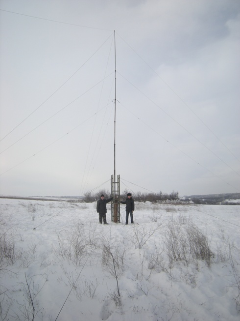 Антена "Зігнутий вертикал". UT2ED, UT4EK біля основи. Недобудований шек. Зліва направо: UT4EK, UT2ED, UV5ENH, UT2EL.