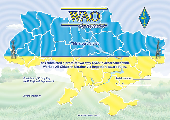 По радиосвязи только через репитеры выдается диплом WAO via REPEATERS.