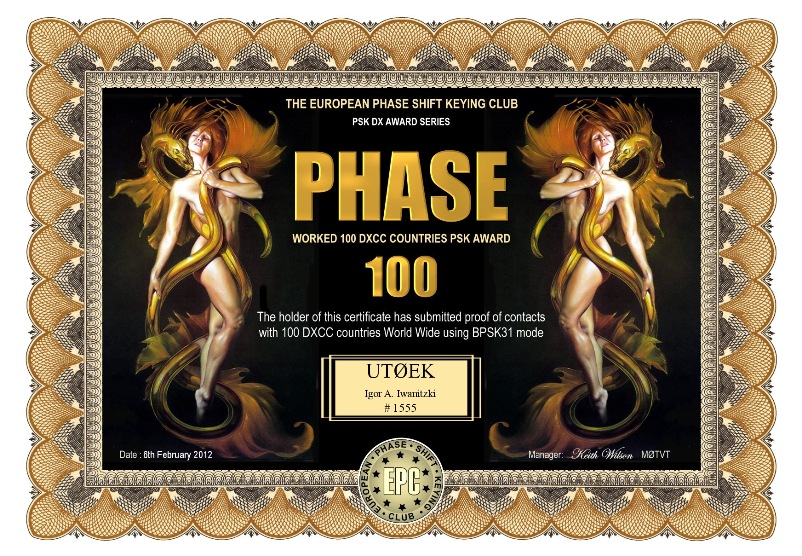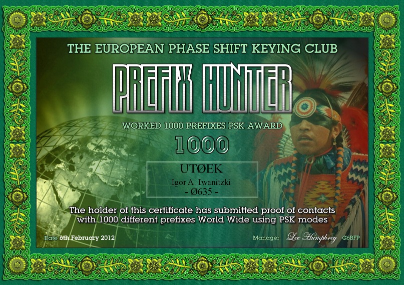 Диплом "Prefix Hunter - 1000" - 1000 префиксов BPSK
